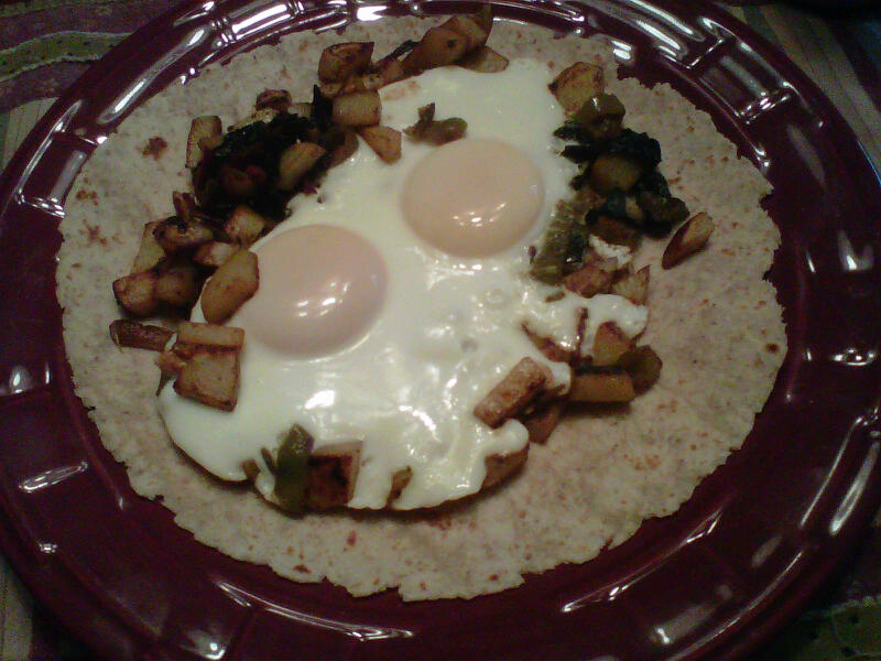 Place the tortilla on a plate, sprinkle on the cheese then place the potatoe mixture on the cheese. Roll, or eat open face and enjoy!!