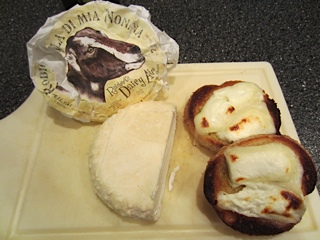 To make the toasts, slice a baguette into half inch slices and toast on both sides, either in a toaster or oven. Brush one side of toasts with olive oil, top with 1/8th inch thick slices of Robiola di mia Nonna, and place under oven broiler for 3 minutes or until melty but not scorched. Cool slightly and drizzle with a little honey; serve on a bed of greens, or however you want to eat them.